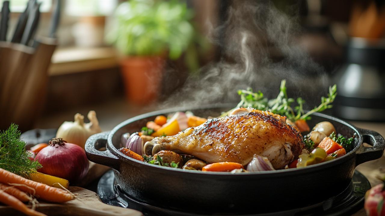 La cocotte en fonte émaillée représente l'ustensile idéal pour cette recette, car elle assure une répartition homogène de la chaleur et permet une cuisson douce et régulière. Optez pour un modèle d'une capacité de cinq à six litres si vous préparez quatre à six cuisses, afin que les morceaux de poulet ne se chevauchent pas et dorent uniformément. La fonte retient parfaitement la chaleur et favorise ce mijotage lent qui attendrit la viande tout en développant les arômes. Son couvercle hermétique préserve l'humidité et concentre les saveurs dans le récipient. Si vous souhaitez accélérer le processus, une cocotte-minute constitue une alternative intéressante qui réduit considérablement le temps de cuisson tout en préservant la tendreté de la viande. Dans ce cas, dix-huit minutes après le début du sifflement suffiront pour obtenir un résultat comparable à une cuisson traditionnelle de quarante-cinq minutes à une heure quinze. Assurez-vous que votre cocotte possède un fond épais qui empêche les aliments d'attacher et garantit une cuisson maîtrisée. Un modèle avec des poignées latérales facilitera également les manipulations, notamment lors du transfert du feu à la table.